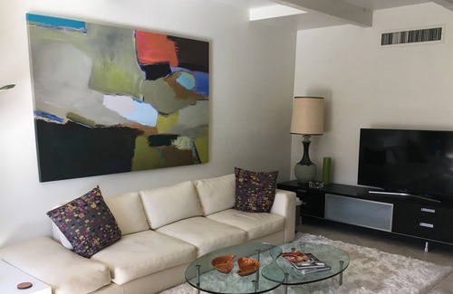 Spacious, fully furnished, midcentury modern 2 bedroom, 2.5 bath two story unit in the heart of South Palm Springs. Enjoy three outdoor spaces and gorgeous mountain views. Dine al fresco in your own private outdoor courtyard. Complex has 3 pools and 3 Spas. Covered carport is steps from the unit. Walk to Smoke Tree shopping complex. Bike or short drive to downtown Palm Springs shopping and restaurants. 30 day minimum rental.