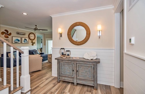 The exquisite master bedroom (Bedroom 1) features a king-size bed, a walk-out to the front porch, a flat-screen TV, and an en suite bath with a double shower head walk-in shower, double vanity, and a generous walk-in closet. Bedrooms 2 and 3 each boast a queen-size bed, a flat-screen TV, and their own en suite bath with walk-in showers, ensuring a luxurious stay for every guest. Bedroom 4 is a delightful bunk room with two bunk beds (4 twins), perfect for the young and young-at-heart. Bedroom 5 is equipped with a queen-size bed and a flat-screen TV. Bedrooms 4 and 5 share a bathroom with a shower/tub combo, providing ample convenience for families. The laundry room on this floor, along with an additional washer and dryer for beach towels in the garage, ensures utmost ease and comfort during your stay.