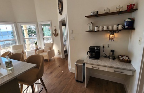 The main floor features a bright living room with high ceilings and large windows looking out to the ocean. The comfortable furnishings, propane fireplace and flat screen TV make for a great place to kick back and relax. The well-designed kitchen features quartz countertops, an island with bar stools and everything you’ll need to cook up a feast. The dining area is located just off the living room and kitchen, with a table large enough to seat eight.
