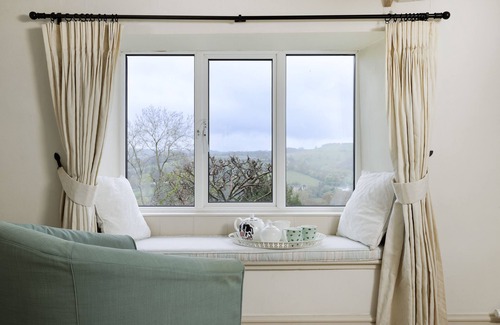 Upstairs on the first floor you will find bedroom one, with lofty high ceilings and oak beams, a king-size bed and lovely woodland views. The family bathroom; bedroom two with a small double (4ft) bed suitable for one guest; and the day room with a 2'6 single day bed (suitable for a child) are also located on the first floor, both these bedrooms feature charming window seats for enjoying the views. Bedroom three is located on the second floor and accessed via steep spiral stairs. This room enjoys more lofty high ceilings, exposed beams, a double bed, and a television. The views from up here are splendid! The property has four bedrooms when the day room is being used as a bedroom, however can only accommodate a maximum of four guests plus an infant.