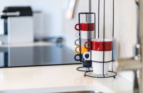 The kitchenette is fully equipped for a comfortable stay, with a stove, oven, microwave, coffee machine, washing and drying machine, ironing board, iron, clothes rack, and essential cleaning supplies, ideal for both short and extended stays. A dishwasher is also available, making post-meal cleanup effortless.