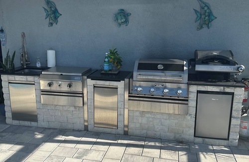 Rent a boat & have it delivered to the house to leave there & head directly to Sanibel or Captiva. Manatees & dolphins are often seen right from pool! New kitchen appliances and washer & dryer. This vacation home has a great location in the desirable SE Cape Coral, close to downtown and all the amazing restaurants. Also just a few miles from the Westin & Cape Harbor waterfront restaurants & Yacht Club beach. The kitchen is fully stocked to make your home cooked meals. Enjoy the coffee bar with your coffee by the pool watching the sun rise. Pool area with outdoor kitchen, bar, 65 inch TV, fire pit. This house has everything you need to feel right at home.