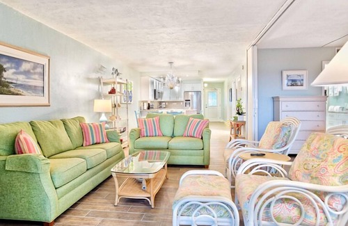 Gulf Front Condo! Step into this colorful first floor totally remodeled condo and relax your cares away. This two bedroom, two bathroom, beach and Gulf front condo has everything you need for a great vacation. The new open kitchen with white cabinets, granite countertops and stainless steel appliances. The new quartz plank floors throughout the condo give a beautiful beachy feel. Enjoy your meals at the large and white dining table with six beautiful blue chairs and a coral light fixture. The large colorful living-room has a flat screen TV, two comfortable couches and two chairs. The master bedroom has a comfy king bed and can be opened or closed to the living-room with the folding wall. The master bathroom has ample closet space new white vanities, glass tiled showers and quartz countertops. Your friends and family will be comfortable in the guest bathroom with two twin beds and attached bathroom. The guest bath features a new white vanity, quartz countertops and glass tiled shower. Relax the days away to the sounds of the ocean on the large lanai that is just steps to the beach. A bright, beautifully decorated beach front condo for the perfect vacation.