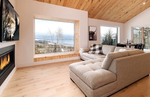 Splendid and warm newly built chalet on an intimate and wooded lot located in the heart of Charlevoix! Equipped with 3 bedrooms and able to accommodate up to 6 travellers, it will be ideal for an activity and mountain getaway with family or friends. Amazed by its abundant windows, its view of the river, its luxury and its comfort, you will be sure to experience privileged and memorable moments. Welcome to Vertigo! As soon as you enter the ground floor, you will be impressed by all the warmth that emanates from the ceiling and the woodwork found there. The space is large, open, friendly and the view of the river is magnificent! Make yourself comfortable in the living room, in front of the fireplace or at the window, and soak up the surrounding nature. The view stretches for miles around! Prefer to cook? We have fitted out a kitchen worthy of a chef, perfectly designed, and an island to receive your guests. Note the purity and simplicity of the design! We opted for black and white contrasts that give character and a Scandinavian look to the whole chalet. A terrace for aperitifs and meals will be available, in season. Further up the floor you will find a master suite - Queen bed - which has its own luxurious bathroom with freestanding tub and shower. The view from the master suite is also spectacular. Besides, you will have a view from all the rooms!! A bathroom completes the layout of the floor. The garden level has a family room with TV as well as an exit to the outdoor terrace and the spa that you can use in all seasons. It also includes two other bedrooms, with Queen beds, which also have their own bathrooms - with shower - almost identical and a laundry room. Again here, the minimalist decor reveals all its effectiveness, because the emphasis is on the view which is magnificent at all times and depending on the sunrise! So are you ready for your vacation? We will receive you with joy! Note that this is a new construction. Landscaping will be done in the spring of 2023. You will have access to the whole house and the land. Note that a charging station for electric vehicles is available. We are available to answer your questions during your stay through Airbnb messages or by phone. Nearby is access to the Marine Forest trail with more than 8 km of hiking trails, rest area and observation platforms. For shops and amenities, you will need to take a car to get to the center of the village of Les Éboulements. You will find a convenience store/grocery store, a gas station, a chocolate factory and a few other local businesses. Food supermarkets, SAQ, restaurants and shops are in Baie-St-Paul, 12 minutes by car. You can walk to admire the different viewpoints on the river, but most amenities are accessible by car. The municipality has several hiking trails. You will also find Le Massif ski resort nearby. The station also offers hiking, a course for mountain bikes and skiing. Le Massif de Charlevoix The Massif de Charlevoix is the highest elevation east of the Rocky Mountains, a spectacular panorama between river and mountain, loose snow as far as the eye can see. An authentic mountain where nature is respected. A place to unwind, far from agendas and concrete. Le Massif is simple pleasure, a highly reputable service that will now be available year-round. Also, nearby: The Route of Flavors The Route des Saveurs de Charlevoix, highlighting the talent of the region's chefs, producers and processors, offers an intoxicating epicurean adventure. Artisans proud of products from our region and who work together towards an ever greener and circular economy. This is an exceptional agritourism experience! The Richelieu manor golf course The Fairmont Le Manoir Richelieu golf club now has 27 high-calibre holes. While retaining the very essence of the original layout of the British Herbert Strong, it is now a harmonious whole highlighting the natural assets of the site, in particular its rugged relief, its woods and its breathtaking view of the Saint-Laurent River. Lawrence. Festival international du domaine Forget Symphonic music, chamber music, jazz evenings, dance and aperitif concerts share the stage. Budding or seasoned music lovers, jazz lovers, lovers of singing, words and poetry, discover outstanding musicians in an idyllic setting, between sea and mountains. Mark your calendars! Le Festif de Baie St-Paul Le Festif de Baie St-Paul is an essential gathering of the Quebec music scene whose local commitment, eco-responsibility, audacity and creativity (flirting with magic) have become trademarks. Produced entirely by a committee of dedicated young people who have the common goal of infusing Baie-Saint-Paul with a dose of magic, this festival, barely an hour's drive from Quebec City, is considered one of the most beautiful festivals of Quebec benefiting from national media coverage. Other attractions Take advantage of all the restaurants and shops in the many towns, including Baie St-Paul and La Malbaie. You can even take a helicopter ride! In Charlevoix, everything is possible.