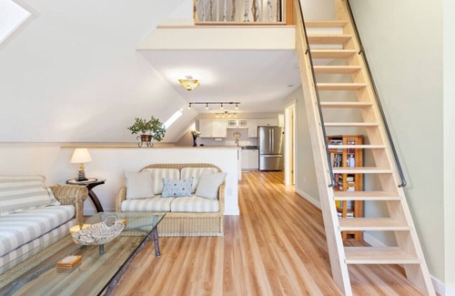 This bungalow has 2 bedrooms and a loft. The loft is accessed with a ships ladder. There is a TV in the loft and in the living room. There is a futon couch in the loft that can be used for sleeping if needed.