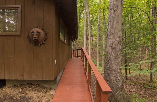 Unique mid-century modern "Half Round" cabin in the woods. Located in the iconic Coolfont Mountainside which consists of contemporary cabins on nearly 400 acres, and was founded as an amazing retreating community in 1969. Half Round has 3 bedrooms, 2 full bathrooms and a fully equipped kitchen. The open dining-living room area has soaring ceilings, 360-view fireplace and walls of glass looking out to the deck and woods beyond. The house is one level with ramp access to the front door and wrap-around deck, with seating and gas BBQ grill. The community in-ground heated pool and hot tub is open Memorial Day through Labor Day. (Year round indoor pool and hot tub available at nearby Coolfont Resort for $8pp/day.) Other community features include on-site hiking trails, tennis and basketball courts, rec field and tot-lot. The Berkeley Springs area of West Virginia is less than a two-hour drive from major metropolitan areas such as Washington, D.C. and Baltimore, Maryland. It is best known for its warm mineral springs and is famous for being the country’s first ‘spa’, frequented by Native Americans long before the first European settlers appeared. This part of West Virginia is rich in history and natural beauty, and draws thousands of visitors each year. Get ready to relax and make memories for a lifetime in this beautiful and cozy mid-century cabin.