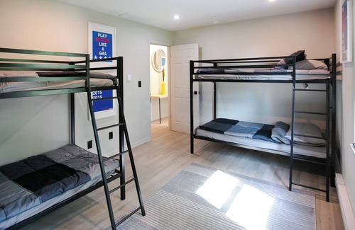 Not only is our location SUPERB for all of our sports-loving Grand Park guests, but you’ll be able to chill in style in our ultra-modern, family-friendly home. Located directly across the street from Parking Lot A, our place is equipped with all of the essentials to making travel feel like “home!” We too are a family that travels all year around for our kids’ sports, so we think we know just what you need when you’re on the road. Come kick up your feet at our Hall of Fame @ Grand Park! This space lives large with an open concept living, kitchen, and dining room with double doors that open up to a 16’ x 16’ outdoor patio featuring a hot tub, picnic table and grilling station. We even have a dedicated kids’ game room with ping pong, pop-a-shot, movies, corn hole, turf, and more!