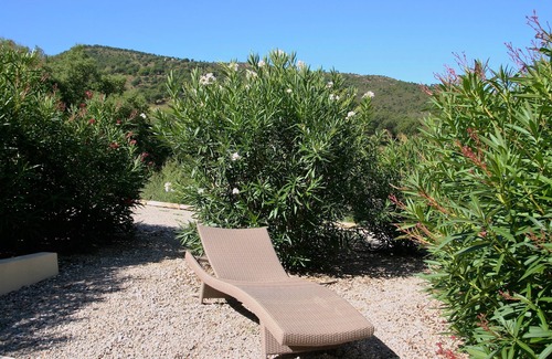 This "mazette" has a private terrace with lounge set (two-seater, 2x one-seater, lounge table + large umbrella) and a dining table with four chairs. From the terrace you have a magnificent view of the "Massif des Maures" and some vineyards.