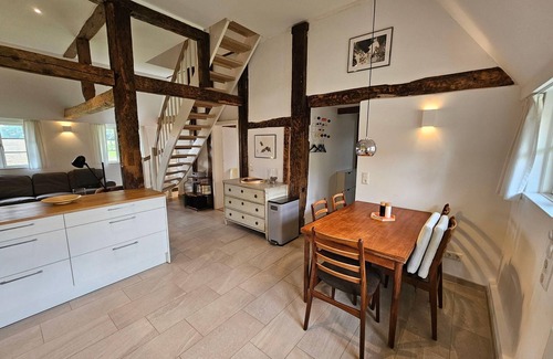 This charming thatched-roof half-timbered house, built in 1840, offers a lovingly renovated space of 100 sqm for up to 6 guests in the Holstein Switzerland region. The open-plan living and kitchen area features high ceilings and a cozy fireplace, complemented by modern furnishings and visible wooden beams that enhance the property's unique character. The ground floor is equipped with underfloor heating, while the bedrooms feature stylish wooden floorboards. A bright, contemporary bathroom boasts a large walk-in shower. A wooden staircase leads to the upper floor, which includes an additional open living and sleeping area with Danish wooden windows and doors. A television with streaming capabilities is available, but regular channels are not included. A children's high chair and travel bed are provided free of charge, and pets are welcome in this delightful holiday home.