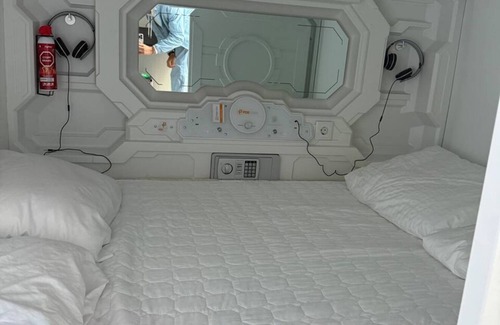 The room features one comfortable double bed (160x200 cm), perfect for couples, friends, or small families. The pod is simply furnished with warm blankets and soft pillows for a cozy experience close to nature.