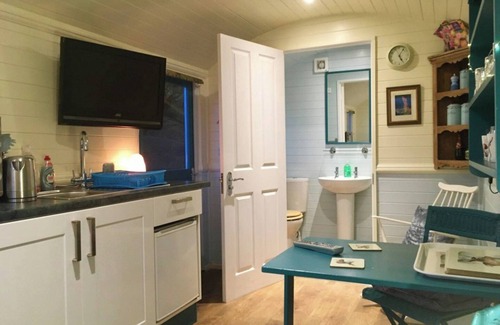 Heartsease has a folding table and chairs in the main body of the hut. Opposite is the kitchenette, which has a small fridge, a sink and a small tabletop oven/grill with a two-ring stove on top. It's equipped with pans, crockery, cutlery, utensils and basics such as cling film, foil, kitchen roll, washing up liquid, cooking oil, mustard, mayonnaise, ketchup and seasoning. It's also got tea, coffee, sugar, herbal teas, a kettle and a cafetiere. There's a 32" Smart TV which can be angled towards the dining area or the bed.
