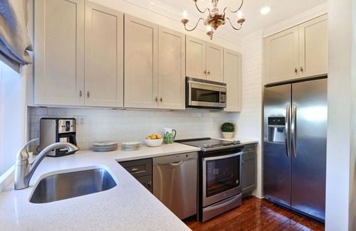 The kitchen, just off the L-shaped space, contains a stainless-steel refrigerator, range/oven, dishwasher, microwave and coffee maker. Like all our Savannah vacation rentals, the home has plenty of tableware, cookware and utensils on hand for your forays into Southern cooking.