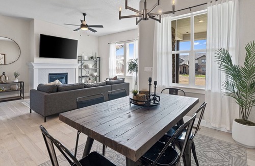 Upon entry, you are greeted by hardwood floors, beautiful modern décor, and an open concept layout. Tasteful light fixtures and designer accents are sprinkled throughout Heron Hideaway at TPC Colorado, providing an elegant and welcoming feel. A comfortable sectional sofa sits central in the living room with a large smart TV and built-in fireplace for chilly nights. A powder bathroom is conveniently located on the main level of the home. The beautifully designed open layout kitchen is well-equipped with the high-end stainless-steel appliances, quartz countertops and huge island. Adjacent to the kitchen is a large dining table with seating for six and large windows bringing in plenty of light- perfect for meals with your group. Don't feel like cooking? Take a short walk and indulge in one of three restaurants at the TPC Colorado clubhouse. The grand Center Stage patio offers majestic views of golf, three reservoirs and the Rocky Mountains- and only minutes away!
