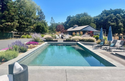 Step into your own personal wine country resort, where indoor luxury meets outdoor paradise. Enjoy our solar-heated pool (mid-April through October, weather permitting) surrounded by lush landscaping. Relax in our premium 6-person stainless steel spa available year-round for evening relaxation. Unwind in the shaded outdoor living room nestled under a pergola beside our thriving vegetable and flower garden. Entertain at our poolside dining area with table seating for eight and six plush chaise lounges for soaking up the California sunshine. Active guests will appreciate our basketball hoop and easy 3-mile bike access to Healdsburg Plaza.