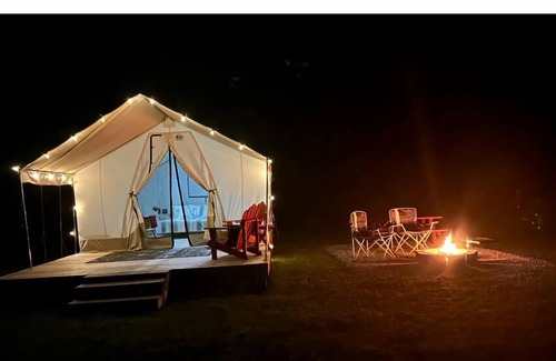 Tucked away in a more secluded area of the property, Glamping tent #1, ideal for couples, is one of our 5 larger glamping units that offer a peaceful off-grid retreat surrounded by trees, and the occasional visit from deer at sunrise. While there’s no power in the tent itself, you’ll find comfort in the simplicity - like a comfortable queen bed with a plush bed pad and a wood stove for warmth on cooler nights.
