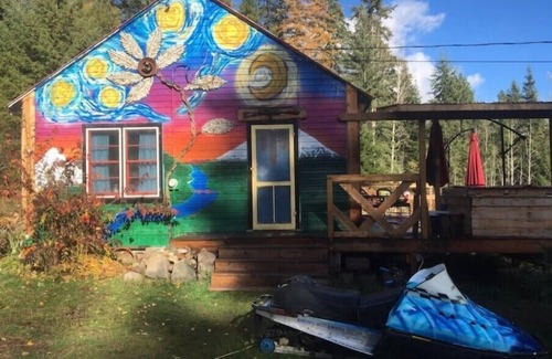 1250 square foot house with deck . 18 acre property . You can walk right out the door to trails that lead up the creek and to a few different water falls . The beach is a 3 minute walk down the hill and the bus stop is right there also . Very colourful house with art work through out . Only 35 minutes to north Ainsworth Hot Springs or 35 south to White water ski hill . Kitchen is equipped with all the appliances and cutlery you need . Coffee maker with local coffee roaster coffees to use .