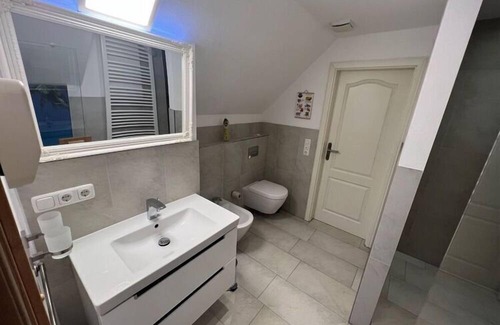 The holiday accommodation is located in the quiet district of Marienleuchte, directly on the Baltic Sea. The apartment is located in an apartment building on the 1st floor and extends over two levels. On the 1st floor there is the living room, kitchen, shower room and bedroom. On the upper floor you will find two sleeping options for 2 people each. There is another shower room and the sauna there. From the living room you can access the balcony. This offers a wonderful view of the Baltic Sea and invites you to have breakfast! The children can play and enjoy the sun on the large, shared garden plot! The natural beach is only 100 m away! Bicycles you bring can be stored in the associated shed. Charging electric cars is not permitted at the holiday home!