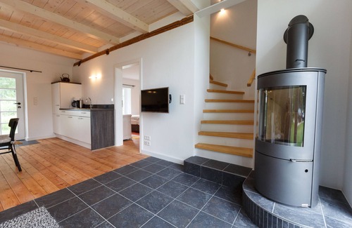 It is about 75 square meters apartment on two floors with two sleeping areas. A bedroom with double bed can be found on the ground floor with adjoining guest toilet. You enter the kitchen with dining table and the living room with large windows and woodburning stove for cozy hours. Via a staircase you reach the sleeping gallery with a large double bed, which can also be used separately as single beds. The shower room with plenty of storage space and large mirror front can be found here.