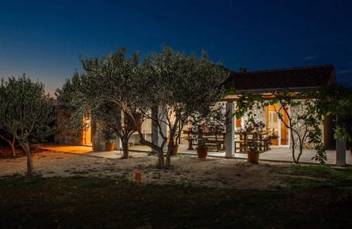 Holiday home Tina is located in an olive grove on a fenced plot and is ideal for a perfect vacation. The house has an outdoor pool and sunbathing area and provides you with privacy. It has four bedrooms, four bathrooms, a living room and can accommodate up to 10 people. It is a great choice for a larger group of friends or family. You can enjoy the warm summer nights with the smell of barbecue and olives.