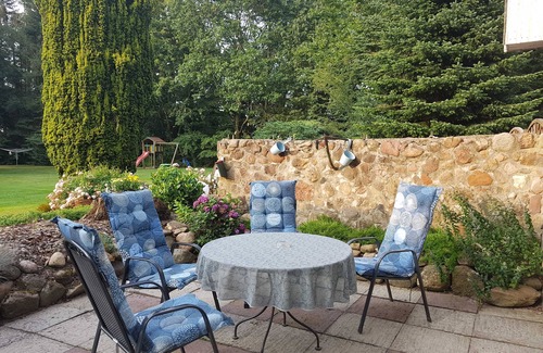Furnishings: kitchen new and fully equipped; Living room about 30 square meters with light cabinets, black corner seat, small reading area and small stove (firewood for free); Bedroom for 2 persons with new furniture, french bed 1,40 x 2 m; Bedroom with new furniture for 1 person plus. Children's travel cot (up to 2 years); Bathroom with shower, small hallway with spacious porch. Terrace with garden furniture and view of the large garden.