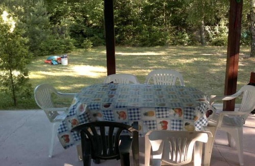 Outside, on a flat and secure area of approximately 800 m2, there is plenty of space to relax and play. The grounds are surrounded by beautiful plantings of conifers, spruces and pines, creating a microclimate conducive to relaxation. There is also a covered terrace with garden furniture and barbecue, a hammock, the possibility to play various outdoor games, as well as a fire pit and a garden with a comfortable garden swing.