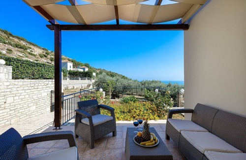 Nefeli Villa is the fifth villa of Agios Antonios Villas, five completely independent 2-storey holiday houses set at a privileged spot of Agia Triada, a serene area perched on a hillside on North Crete, with unlimited views of the Cretan sea. The center of Rethymno is only 20 minutes away, a visit to the nearest sandy beach (Adele) will only take 10 minutes by car, while Heraklion and Knossos is an hour's distance from the villa. Grocery shops, traditional taverns and minimarkets can be found at the village in a distance of 1 km. Here, you can take a sign of the magnificent Cretan nature walking through the gorge of Patsou, which starts just 800 meters away from the villa. Most of the beaches of the north coasts have been awarded with the Blue Flag. Bali and Geropotamos Beach are still hiding some quiet corners to enjoy your bathing, while Arkadi Monastery is a wonderfully peaceful place, with a delightful Baroque church that became the central meeting place for Cretan revolutionaries against the Turks.