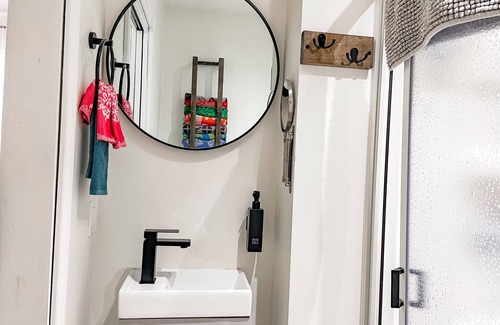 - Compact vanity and sink to maximize space