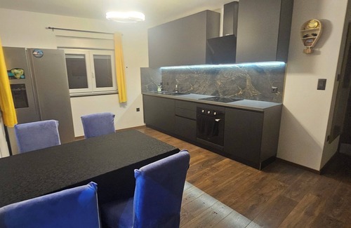 The house is located at the entrance to the city of Split. Quiet street with only a few houses. Completely new and renovated, decorated. Guests have at their disposal the whole house, 5 bedrooms, 4 bathrooms, one room with a toilet, 2 kitchens, 2 living rooms, grill, deckchairs, swimming pool. In the vicinity of all amenities, 200m distance: bakery, shop, train station, bus station, children's playground, cafe, restaurant, drugstore...