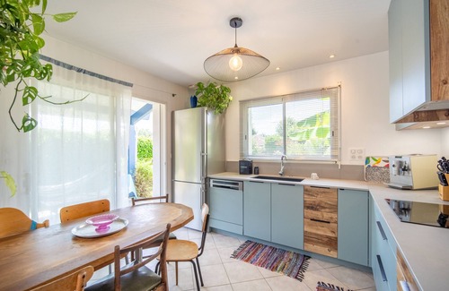 Comfortable house 8 km from the ocean (suitable for nautical activities such as surfing, bodyboarding or other ...) with fully equipped kitchen open to the dining-living room where a large ultra-comfortable corner sofa awaits you. .. all open on a wooden terrace covered by waterproof shade sail where a 10 pl outdoor table accompanied by a plancha will allow you to spend a good time outdoors, all decorated with a heated outdoor pool, with a bench seat over the entire width with unmissable view of a large oak tree (ideal for an aperitif !!).