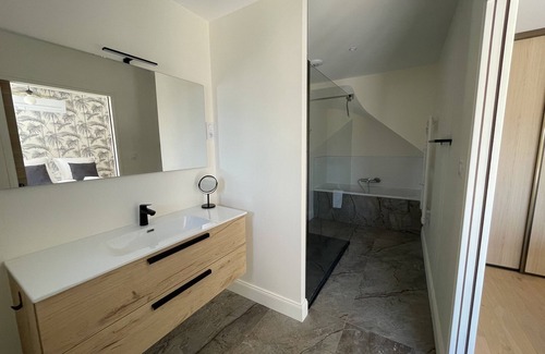 Sleeping 4 to 13 people, the main house comprises a fully-equipped kitchen on the ground floor, a vast living room opening onto a large veranda with reversible air conditioning and views of the landscaped garden. A master suite with a bathroom equipped with shower and bathtub, all overlooking the garden, and a separate toilet with PRM access.