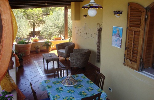 (Text automatically translated) The house is surrounded by a large olive grove, between the nature reserves of the "Gypsy" and "Mount Hood" behind the bay of Santa Margherita. (Gulf of hood 300 mt.) Stretch of coast of natural beauty, accessible through the use of electric train at free of charge. The site for its tranquility lends itself to relaxing holiday. The house consists of a comfortable bedroom with a canopy bed, a large living-room with kitchen, a bathroom with doccia.Inoltre has a large covered veranda with sea views, Cape San Vito, and Monte hood. The rooms are adequately furnished and equipped. The house, in typical Mediterranean / Tunisian was built in 1997 is regularly recently restored 2007. It has outdoor spaces with parking, barbecue and outdoor shower, use of bicycles. weekly rent, including water, electricity, gas and bed linen, bath linen. Attractive prices.