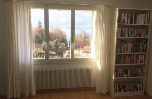 Modern furnished house overlooking Lake Thun near Interlaken / Jungfrauregion / Bernese Oberland. 5 kilometers from Interlaken. The bus station (public transport) is located 2 minutes (100 meters) from the house. The boat station and the shore of Lake Thun can be reached on foot in 5 minutes. The buses run only during the day until about 19 clock. If you want to go to Interlaken in the evening you either need your own car or you can take a taxi for about 20 Swiss francs.