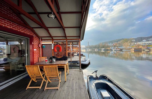 Outstanding quiet location in Cisarska louka island - close to the heart of the Prague. We provide a small boat with electric engine (no license necessary), free parking spot in a private area, just few steps of the houseboat. For those of you, who like the touch of the nature, you can feed swans from the terrace and observe other species in their natural habitat. The view from a terrace is partly industrial, but at the night time full of calm magic.