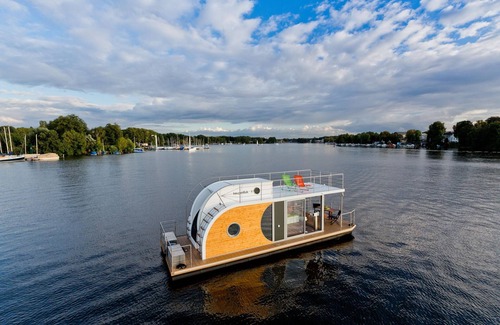 Would you like a very special holiday home? Then this stylish and well-equipped houseboat on the Dahme for up to 4 adults and 2 children is exactly what you have been looking for. As captain of your houseboat, you determine the course. In the morning, step out onto the terrace with a fresh coffee and enjoy the morning silence and the peaceful atmosphere on the lake. In the evening, the whole family gathers here at sunset for a delicious meal followed by a social gathering. During the day, the private sun deck with loungers is ideal for getting your own tan. Should the weather be bad, you can simply retreat inside your houseboat and make yourself comfortable on the cosy couch with a glass of wine or hot tea. The houseboat has been lovingly furnished and radiates peace and serenity at first sight - from inside and outside. Enjoy nature from a side that is hardly accessible to you on land routes. Details: consumption-based energy costs, bed linen, towels, final cleaning Activities in the area: Whether you are awakened by the screams of wild geese on a lonely more or the day to the banks of the Dahme closing with a glass of wine after a visit to Berlin - dreams come true on this houseboats. Spring in the morning instead of showering in the bright water of the lakes or book one of the boats as a holiday home in winter and start your winter walk on skates directly from the terrace Mobility: not suitable for people with limited mobility