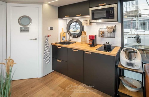 Our houseboat Seahorse is located in the beautiful Heiligenhafen. The houseboat is the ideal vacation spot for people who want to spend a relaxing and beautiful vacation on the water as a couple (or alone): a break from everyday life, birthday, engagement, wedding, honeymoon, or just because? Everything is possible. The houseboat offers a living and dining area with TV and internet, a fully equipped kitchen with dishwasher, ThermoMix and coffee machine, a bedroom with a double bed, a bathroom with toilet, a terrace, a sun deck. And the cherry on the cake: a bio sauna * that you can use for free. The bio sauna has a 3 kW oven that reaches usage temperatures of 45°C to 60°C.