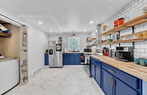 The spacious 3 level house is perfect for your get away! The main floor hosts a freshly renovated kitchen, large dining area, living room, 2 bedrooms, and 1.5 baths. The top floor has 2 bedrooms, a bathroom, and a sleeping loft. In the basement there is a pool table, Foosball table, and 2 bedrooms. The basement leads our to our large yard with giant, covered hot tub and fire pit.