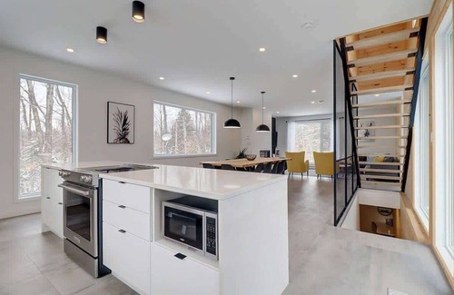 Nestled in a peaceful 3-acre wooded estate, this house offers absolute tranquility while being just 5 km from the village of Eastman and close to the Mont Orford and Bromont ski resorts. In every season, enjoy special moments: relax in the spa after a day outdoors or gather around the outdoor firepit under a starlit sky for memorable evenings.