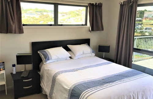The Master bedroom has a walk-in wardrobe, ensuite bathroom, wall mounted TV screen, a view of the bay and a sliding door that opens up onto the front deck. Hotel grade freshly laundered bedroom and bathroom linen is included for every visit.