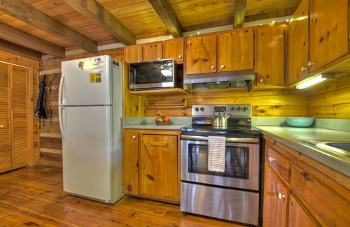 Perched alongside the tranquil banks of Weeks Creek, this enchanting creek front cabin rental in Blue Ridge offers a serene retreat amidst the North Georgia Mountains. A haven of peace and quiet, this pet-friendly cabin sits on over an acre of pristine land, inviting guests to unwind and reconnect with nature.
