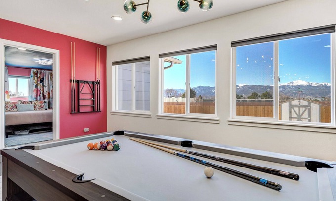 Welcome to our pet-friendly, ranch-style retreat, perfect for families and large groups! Enjoy an open-concept living, dining, and kitchen area, ideal for gathering. Take in breathtaking 180-degree views of Pikes Peak, unwind in two master suites with en suite baths, and stay cool with central AC. Have fun with the pool table and let your pets roam in the large fenced yard. Conveniently located near Colorado Springs’ east-side shopping and amenities, this home has it all!