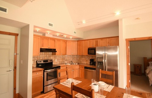 This open concept, spacious top floor unit has been renovated with a bedroom on each side of the living space and fully stocked kitchen. Both bedrooms have queen beds and full bath ensuites. Relax on the private deck and enjoy the views while barbecuing. Hardwood flooring throughout the living room, laundry, Wi-Fi, 2 cable TVs with Blu-ray, videos and games in this beautiful third floor unit. Central Air Conditioning throughout the complex. Spectacular views from the heated outdoor pool and hot tub with a huge deck overlooking Lake Windermere.