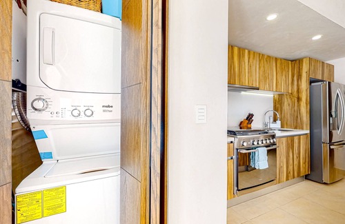 Experience the extraordinary when you book this fantastic vacation rental just a short distance from the white sands and emerald sea. Located in a gated community, you'll adore the peace, tranquility, and relaxation throughout this stylish, brand-new apartment. A short drive is all takes to reach local supermarkets, including Tulum proper, which has restaurants to sample, souvenir shops, and other shopping options. The Tulum Hotel Zone in particular is known for its beach clubs, cafes, and boutiques! The Grand Cenote, as well as other cenotes in the area, are only minutes away for refreshing swims and gorgeous views. You're also conveniently placed next to a big communal pool, and have access to amenities such as a fitness center, yoga room, basketball court, and a kids' playground.