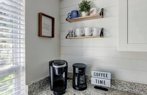 Our dedicated & stocked coffee corner is the perfect spot to begin your day, indulging in complimentary coffee or tea, surrounded by coastal charm and Southern sunshine! As the day winds on, and caffeine isn't the ticket--may we recommend a glass of wine!