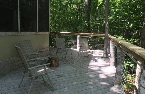 The large deck looks into the canopy and down to the dock. It is perfect for grilling and enjoying an outdoor meal, bird watching, and having a firefly counting contest. There is also an outdoor fire pit, complete with plenty of free firewood to enjoy a fire while enjoying an evening breeze.