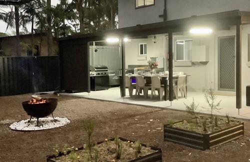 The back yard is planted with native grevillea to attract the many birds and native little lizards that like to visit and there is a firepit to add to the ambience.