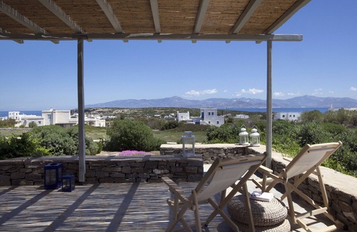 Just a few minutes’ walk from an idyllic sandy beach, possibly the most family-friendly on the island, you will stay at the serene oasis that is Villa Daphne. Lounge under its shaded terrace and take in the sea and island views, breath the gorgeous smells coming from our tended garden and relax like you never have before. Our home sleeps up to 8 guests and has two living areas on separate floors, so that everyone can have their own space to enjoy themselves.You will be located at the tranquil and exclusive area of Santa Maria in Paros. The area is dotted with beautiful homes and the crystal-clear waters of our local beach, Mikri Santa, are a walk away. The villa is set in a 1000 m2 plot of land with olive and fruit trees, aromatic herbs, lavender and wild flowers, all of which we welcome you to use along with the BBQ. Our home has been carefully designed and built following the minimal Cycladic architecture, using local materials of the highest quality, in order to blend harmoniously with Paros’ gorgeous natural environment. It has large shaded terrace with fabulous sea views which is ideal for al fresco meals or evening cocktails with the moon and the lights from Naxos island flickering across the sea. The interior spaces are bright and tastefully decorated in cool tones of white and beige. Simple lines, earth-colored furniture, stone and polished concrete floors and Aegean white walls bring out a laid-back feeling. The layout offers the best possible privacy for everyone living in it.The functional open plan kitchen is fully-equipped with cooking utensils and serving plates.You will have access to a fully equipped and independent villa, with a private shaded terrace and garden. Feel free to pick aromatic herbs from your cooking!As much or as little as you want. We often stay nearby but even when not there we are only a phone call/email away in case you need help or advice.The neighborhood is a private residential area with villas. The local beach, Mikri Santa, is sandy and it’s waters are shallow making it ideal for kids. While lounging on Mikri Santa you will be able to order coffee, refreshments and snacks. There are a couple of excellent restaurants just a few meters away from the beach. The picturesque town of Naousa is just a few minutes’ drive away. It has a lovely little port, whitewashed cobbled streets, bars, restaurants, and shops. Many of Paros’ world-famous beaches are also close to Villa Daphne, both by car and by bus. We will provide you with a complete villa manual with suggestions for restaurants and beaches on the islandThe closest bus stop is just 20 meters away from Villa Daphne, but the last bus from Naousa back to the villas is at about 6pm. So if you decided not to rent a car, which we highly recommend, and want to have a night in the town you may want to make arrangements in advanced with a local driver.Villa Daphne is your home away from home, for a relaxing and memorable holiday!