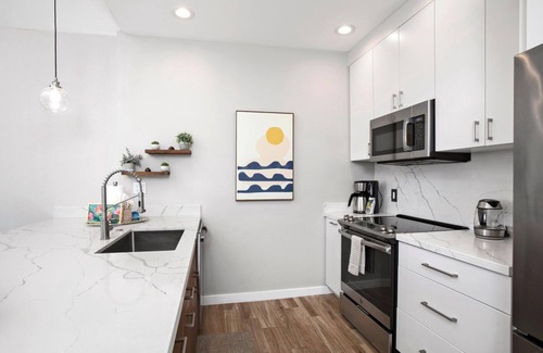 Each private bedroom is complete with a King-size bed and plush pillows and linens for a great nights' rest. Plus, ample closet space for all your clothing storage needs. The master bedroom features an in-suite bathroom with a remodeled double-vanity and large, walk-in 2-person shower. The second bathroom, located off the second bedroom, has also been recently remodeled and includes marble countertops, a full bathtub, and a custom-tiled shower.