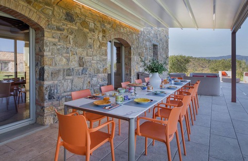 The fenced park covers eight hectares, with olive groves, garden paths, aromatic shrubs and rose bushes. A lawned park surrounds the villa and guests can use the small seasonal vegetable garden. Two furnished pergolas offer shaded areas for outdoor dining: one next to the villa for breakfasts and lunches, and one near the adjoining pool for evening appetizers. A gravelled driveway and stone steps lead from the driveway to the main entrance. A charging station for electric vehicles is available. N.B.: Please note that the photo shoots are usually carried out in spring, so the colors and blooms of the gardens, lawns and parks may be different when you enter the villa.