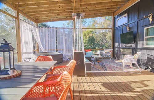 A bubbling hot tub right on the deck awaits you — the perfect way to unwind after a day exploring the town or relaxing at the beach.
