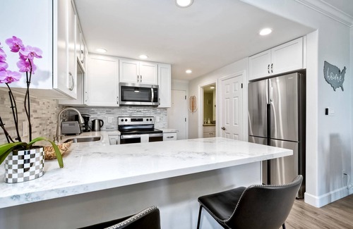 Step inside La Costa Gem where California beach vibes meet modern elegance. The living room invites you to relax with a comfortable sofa, stylish armchairs, and a smart TV for cozy movie nights. The fully equipped kitchen features sleek stainless steel appliances, modern white cabinets, and stone countertops, making it easy to prepare meals or morning coffee with the convenient Keurig. Dine at the table for four or enjoy casual seating at the kitchen counter for two. The bedroom offers a peaceful retreat, complete with a dedicated workspace for those who need to check in on work while enjoying their stay. After a day enjoying endless activities, pour yourself a glass of wine and enjoy the California breeze from your balcony.
